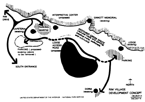Under normal circumstances, then, the average visitor to Rim Village arrives by car, parks in the cafeteria lot, and heads for the cafeteria or rim area 1, visiting both before leaving. The result is a north-south use pattern across the cafeteria lot. Most visitors never get to the other rim areas or the interpretive facilities (located in rim area 2).