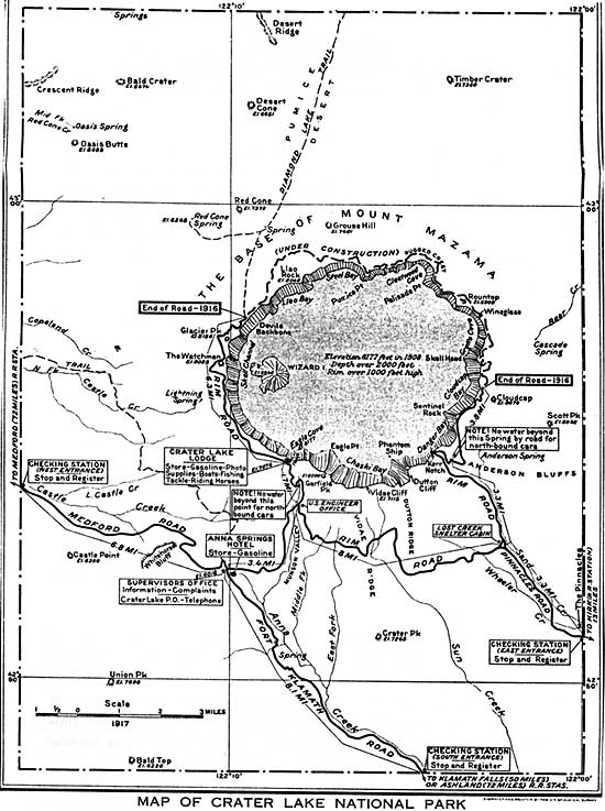 The circular provided considerable information on the services and accommodations provided by the Crater Lake Company, which had agreed to a revised five-year concession contract with the Department of the Interior effective January 1, 1917. The company operated daily automobile service between Medford (83 miles from the park) and Klamath Falls (62 miles from the park) and Crater Lake. Automobiles left the Hotels Medford and Nash in Medford each morning, stopped for lunch at Prospect, and reached the lake in the evening. Returning automobiles left Crater Lake each morning, reaching Medford in time to connect with outgoing evening trains. Automobiles left the White Pelican Hotel in Klamath Falls each morning and arrived at the lake at noon. Returning automobiles left the lake after lunch and reached the White Pelican Hotel in time for supper. The rates for these automobile services were: