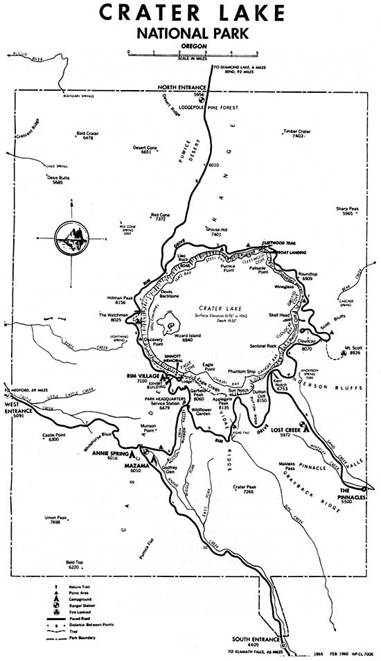 The Mission 66 program at Crater Lake included a variety of improvements to facilities and services designed to upgrade the quality of the “visitor experience” in the park. The elements of this “experience” were ably described in the annual park handbook. For the purpose of understanding the “visitor experience” in the park as a result of the Mission 66 program the 1965 edition of the handbook will be used. (A map of the park in 1965 may be seen below.)