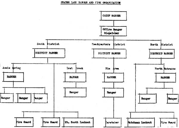 The Crouch report analyzed the need for additional ranger personnel in the park. The ranger force should consist of the chief ranger, and an assistant chief ranger who would handle the headquarters district during the summer and supervise ranger activities throughout the park in the winter when the chief ranger was stationed at Klamath Falls. Two permanent park rangers were needed to supervise forest protection and visitor use activities in the park. The ranger in charge of forest P>protection would be responsible for: