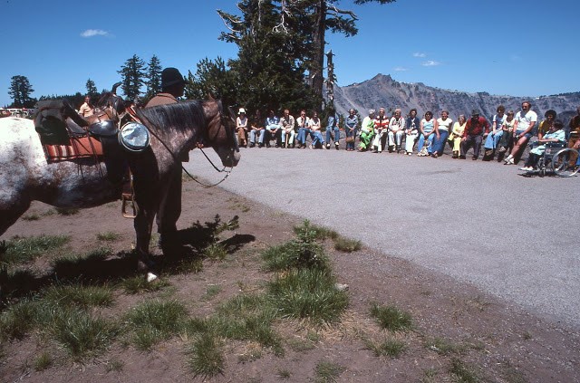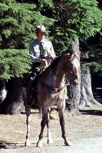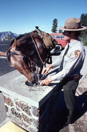 The horses were used mainly on the Rim as PR and to be able to observe the park visitors. The big problem was we had to clean up after the horses. So, in uniform, with a shovel and plastic bag, we would start shoveling. We had a special area near the cafeteria where we stashed the bag and the shovel. The horses were used by the interpretative staff for some great living history programs, like the first explorers to find the lake, as in John Wesley Hillman. The horses were used to patrol the boundary areas during hunting season. The horses also were used for search and rescue.