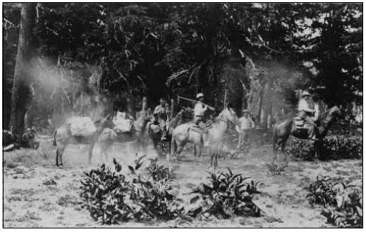 Hart Merriam, Chief U.S. Biological Survey, in lead on horseback, followed by his assistant Vernon Bailey on horseback at Crater Lake in August 1896. Photo courtesy of Crater Lake National Park. |