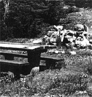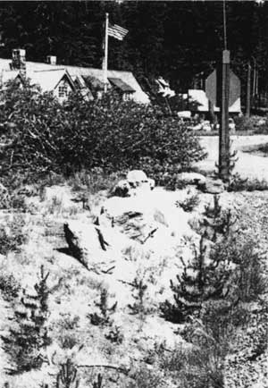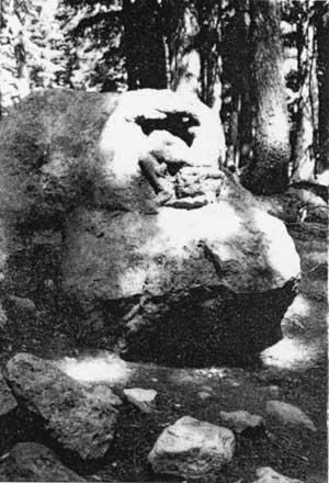Carved by Earl Russell Bush in 1917, the sculpture stands approximately three feet high and is located 400 feet west of the Ranger Dormitory. A rustic wood sign identifies the site which can be reached by trail from the plaza area.