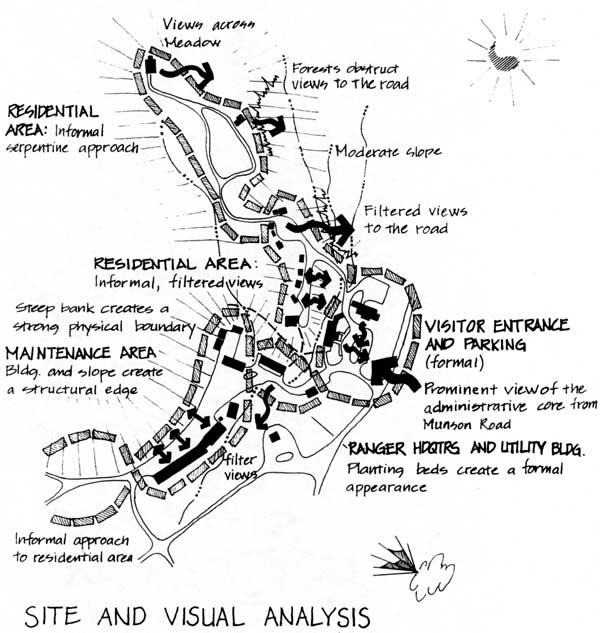 1. It is important to retain the integrity of the historic landscape at Munson Valley by protecting the general canopy cover, viewsheds, and building and circulation layout. These land patterns and relationships define the historic context of the site and contribute to the historic scene. It is important to maintain “a commanding view” of the administrative complex upon arrival to the site (Lange, 1932). The view corridor to the administrative plaza from the road should remain unobstructed and other areas adequately screened.