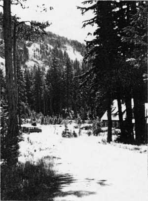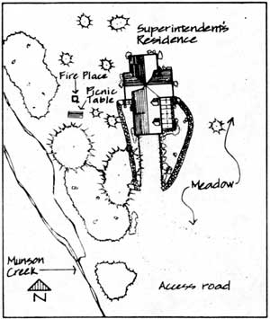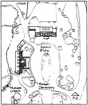 Sleepy Hollow and maintenance area intersection Munson Road intersection at center back. Trail to the middle group of residences and stone bridge crossing Munson Creek west of the Ranger Dormitory. |