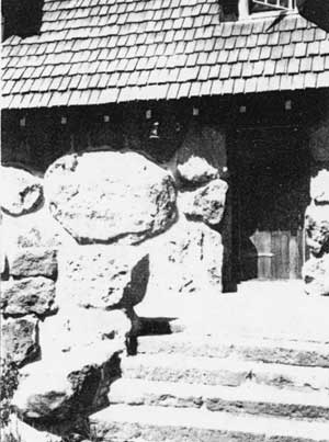 Battered or “rusticated” stone features were a functional, harmonizing element of the Munson Valley landscape. Designed to stand alone yet fit visually into the landscape, stone features provided definition and organization to circulation and plantings. Features at the Administrative complex include stone curbing and a drinking fountain in front of the Administration Building. Other features include a stone bridge over Munson Creek, stone steps between the Ranger Dormitory and the lower cottages, masonry work to hide culverts where the roads crossed the creek, and flagstone walkways at several buildings. Weathered boulders once used for visual effect and to control traffic along the 1934 entrance to the Administrative complex are extant and visible among the plantings south of the ellipse.