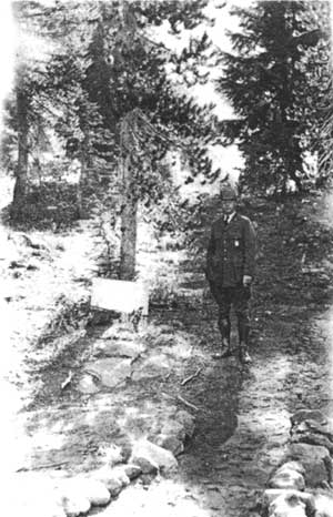 Park naturalist at the footpath access to the Castle Crest Wildflower Garden from the Administrative plaza, c.1930. (CRLA Park files) |