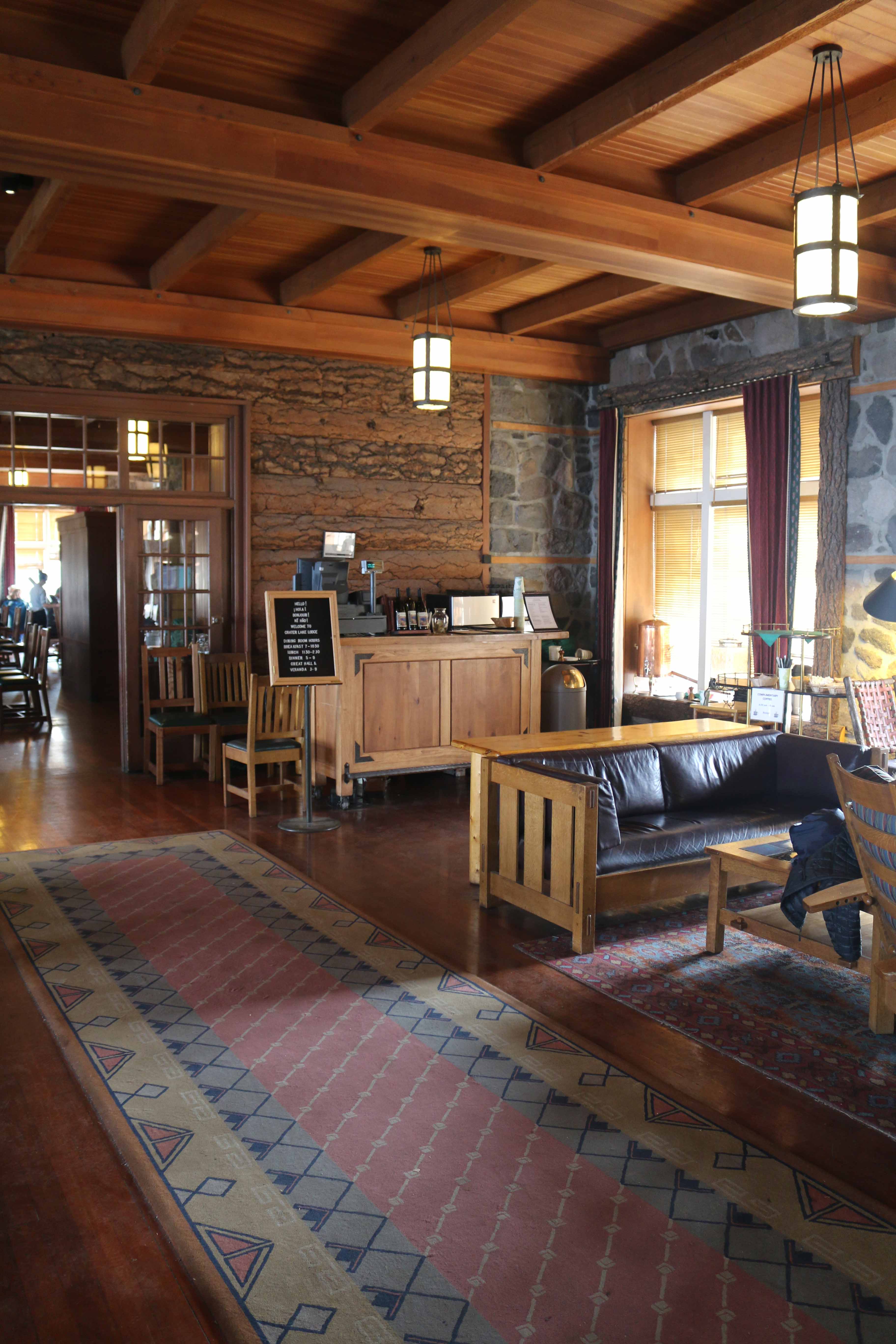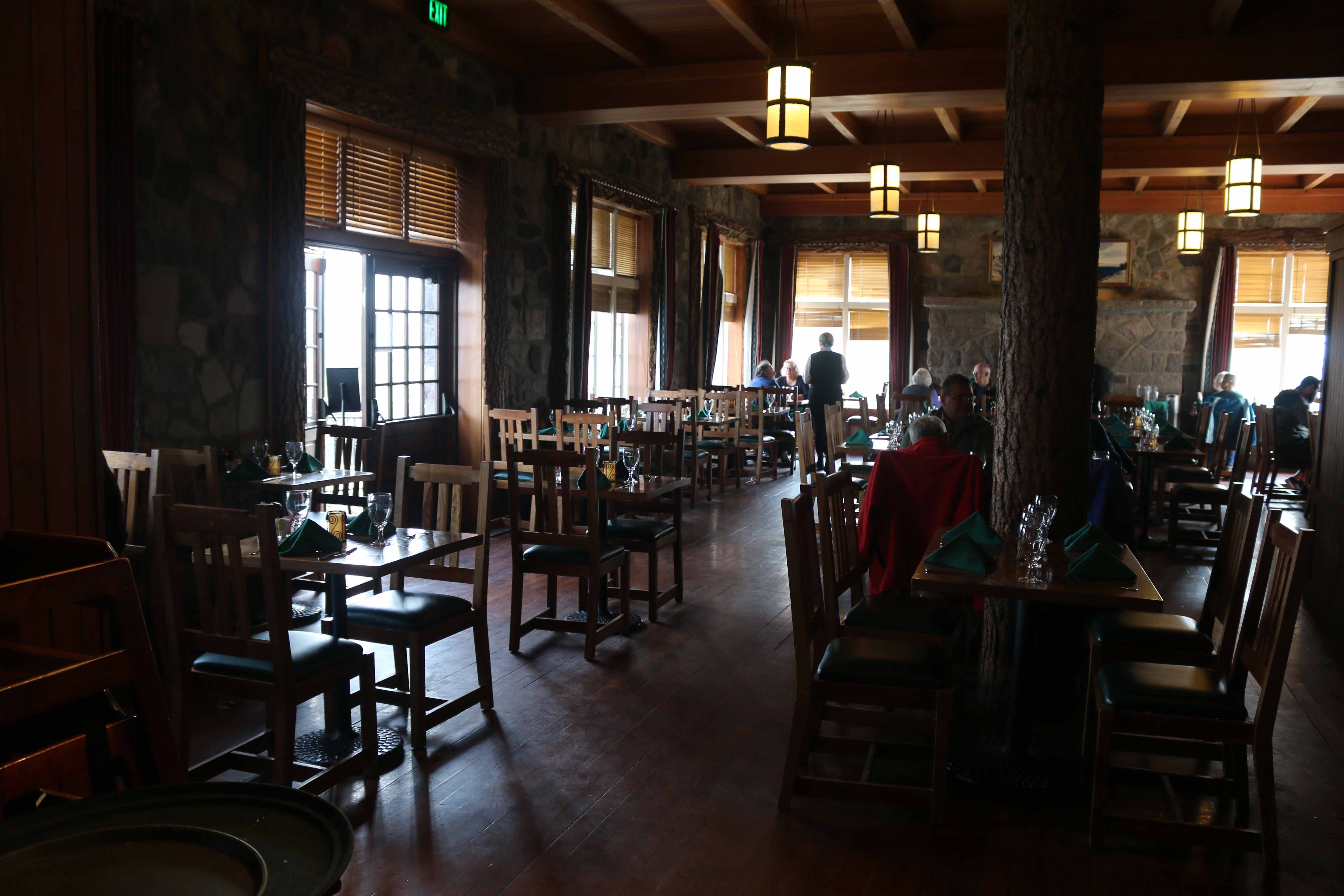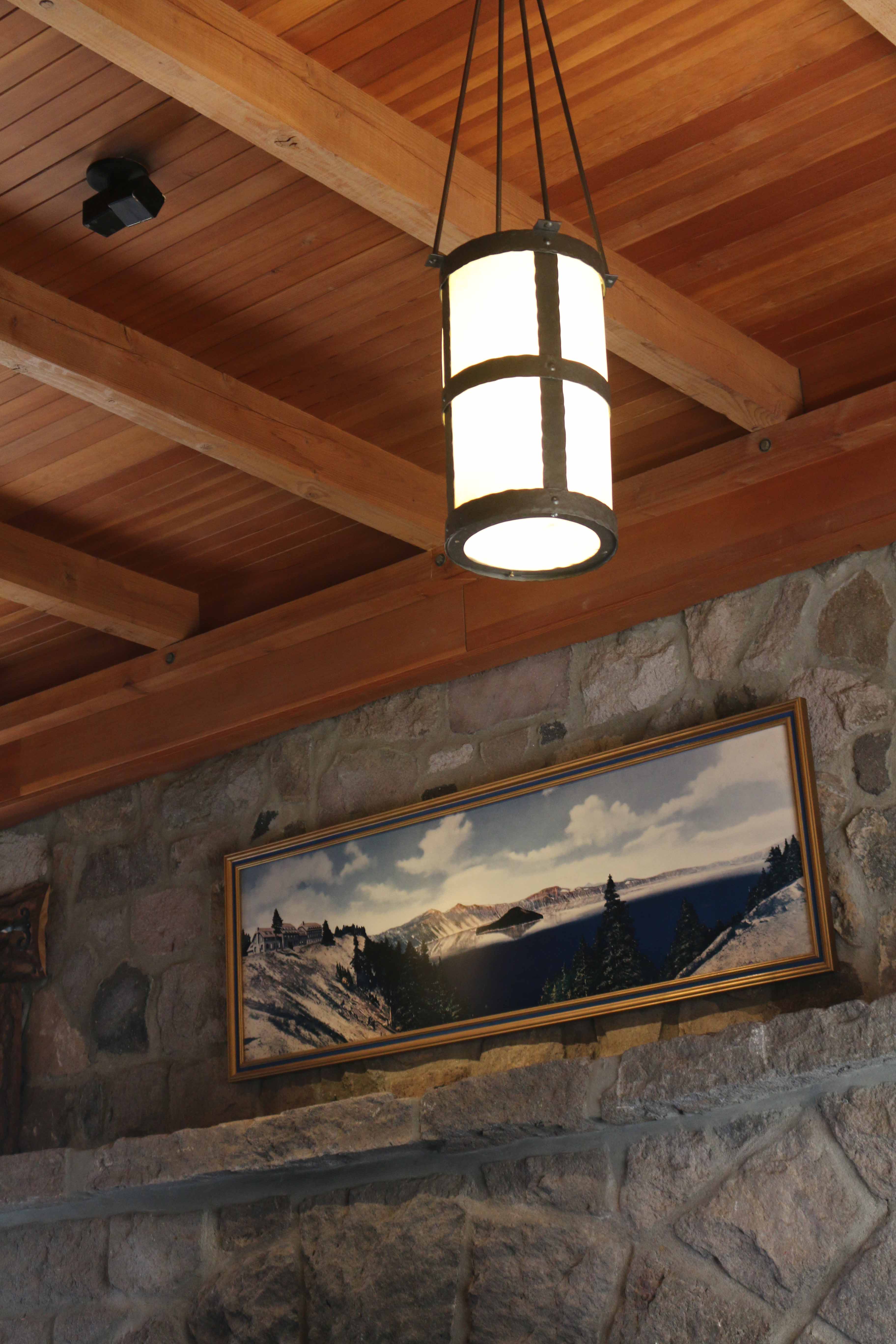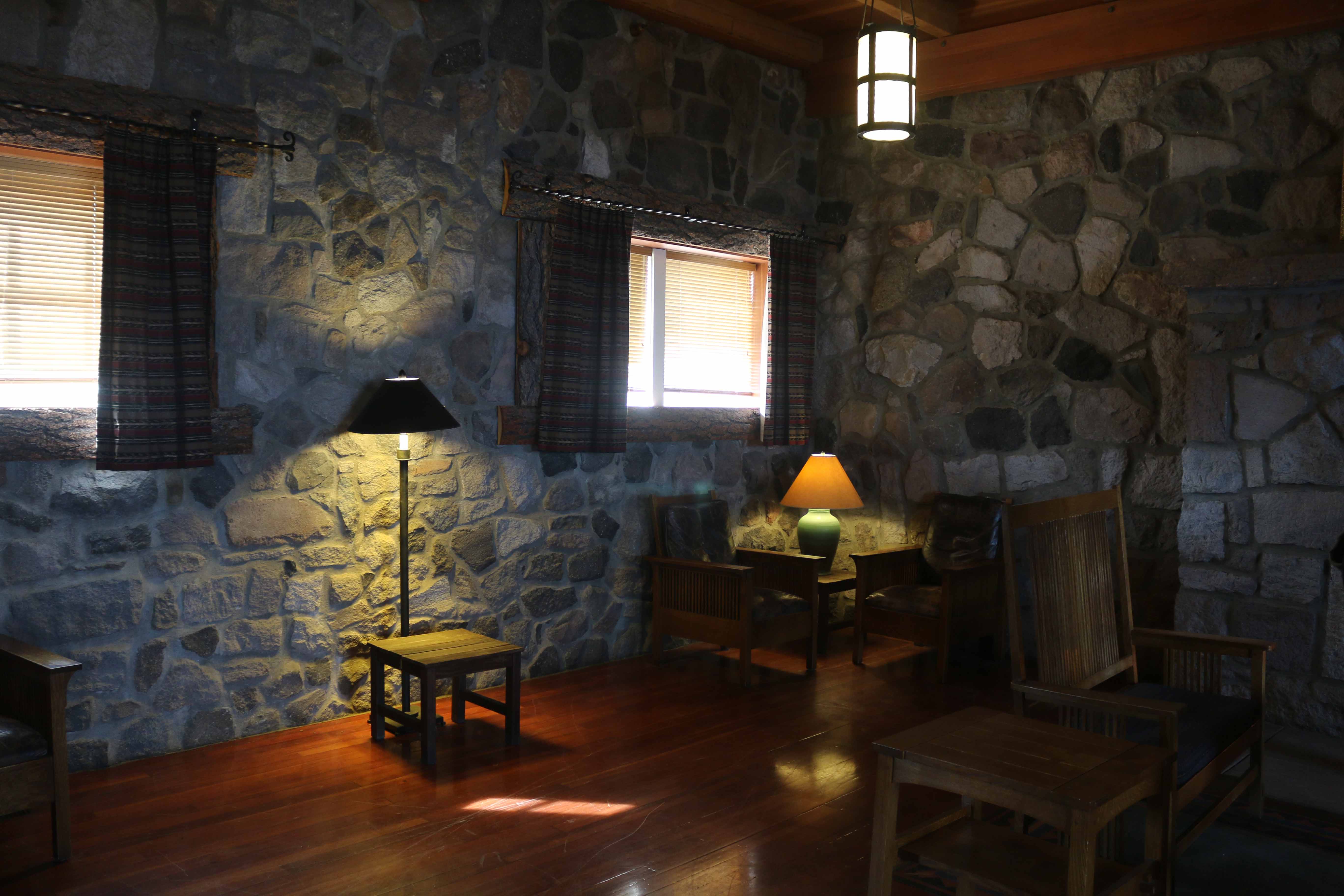 At the east end of the Rim Village is Crater Lake Lodge, a hotel whose irregular shape forms a slight crescent. Its exterior appearance features stone masonry on the ground floor’s outer walls and a roof punctuated by numerous shed dormers which give visual interest to the wood shingled jerkin head configuration. Massive stone masonry in chimneys on the east and south facades draw the eye, as do overhanging and bracketed eaves. Multipaned windows, which are arched with stone lintels on the ground floor, are another character-defining feature of the original hotel that was reconstructed in a NPS rehabilitation project that took place between 1991 and 1994. Much of the historic fabric in the lodge was lost during this project, something which also brought about drastic changes in the building’s plan, mass, and structural character.