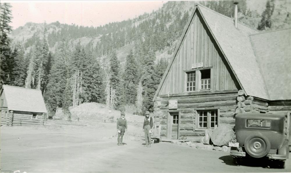 Administration building Ranger cabin to left in Crater Lake NP, circa 1930