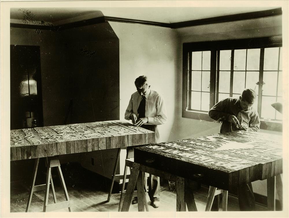 Carving Letters on Redwood Slabs. Upstairs room on West end of Ad. Building in Crater Lake NP, Nov 1936 probably Lange photo – Lange is on left