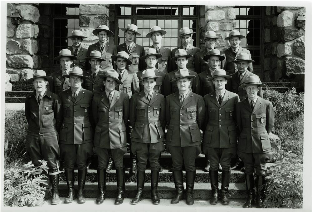 Entire Ranger Force in Crater Lake NP, 1941 front of Ad Bldg
