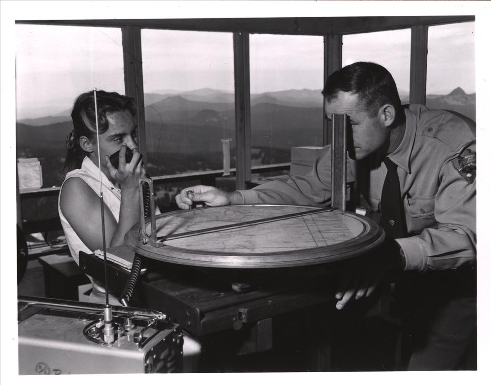Fire Lookout and wife at work Watchman fire lookout, photo by Jack Boucher Aug. 1960