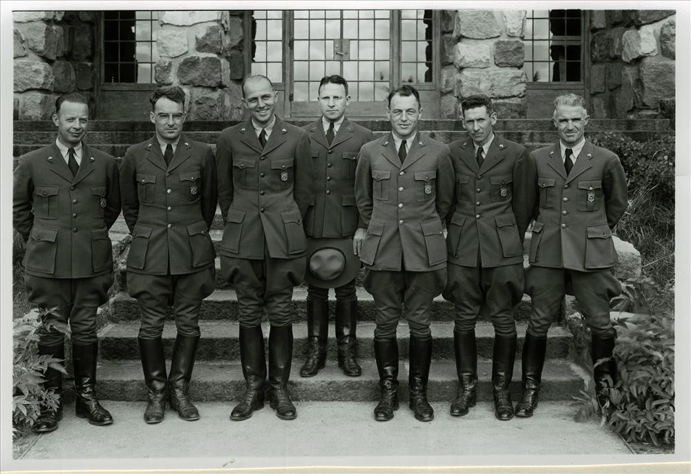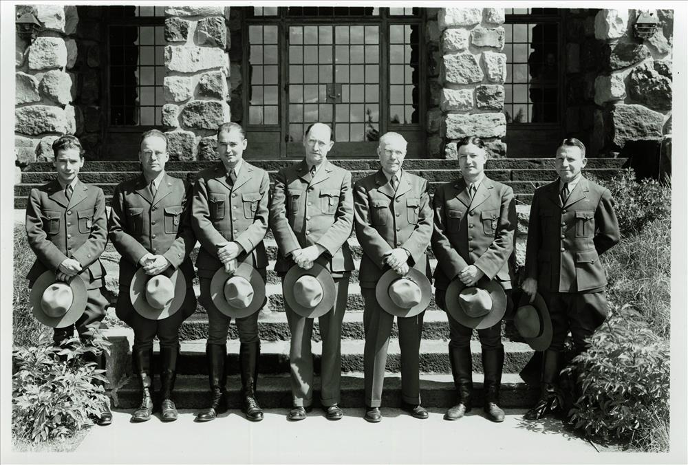 Supt. E. P. Leavitt and permanent uniformed staff. Left – Crouch, Frost, Foyles, Fitzgerald, Leavitt, Parker, Gilbert, and Ruhle Park HQ Grant Aug. 18, 1941