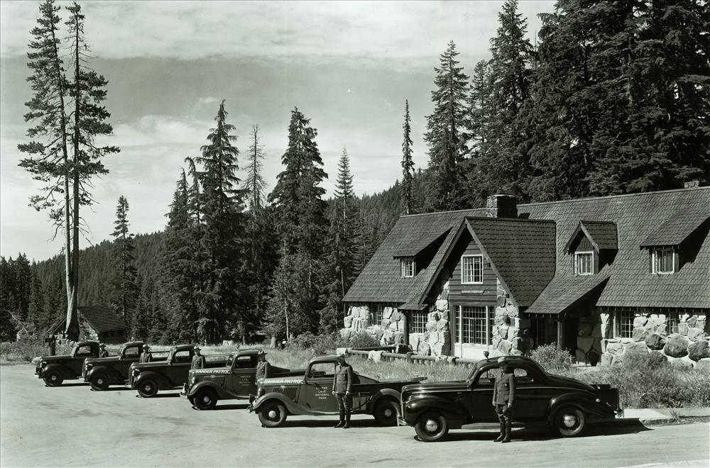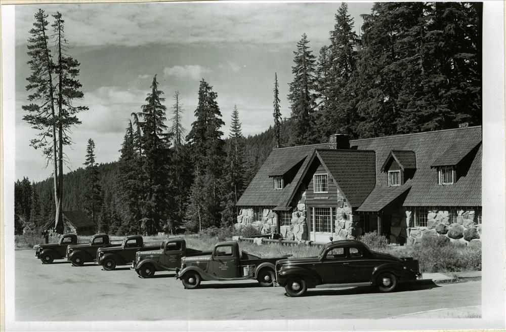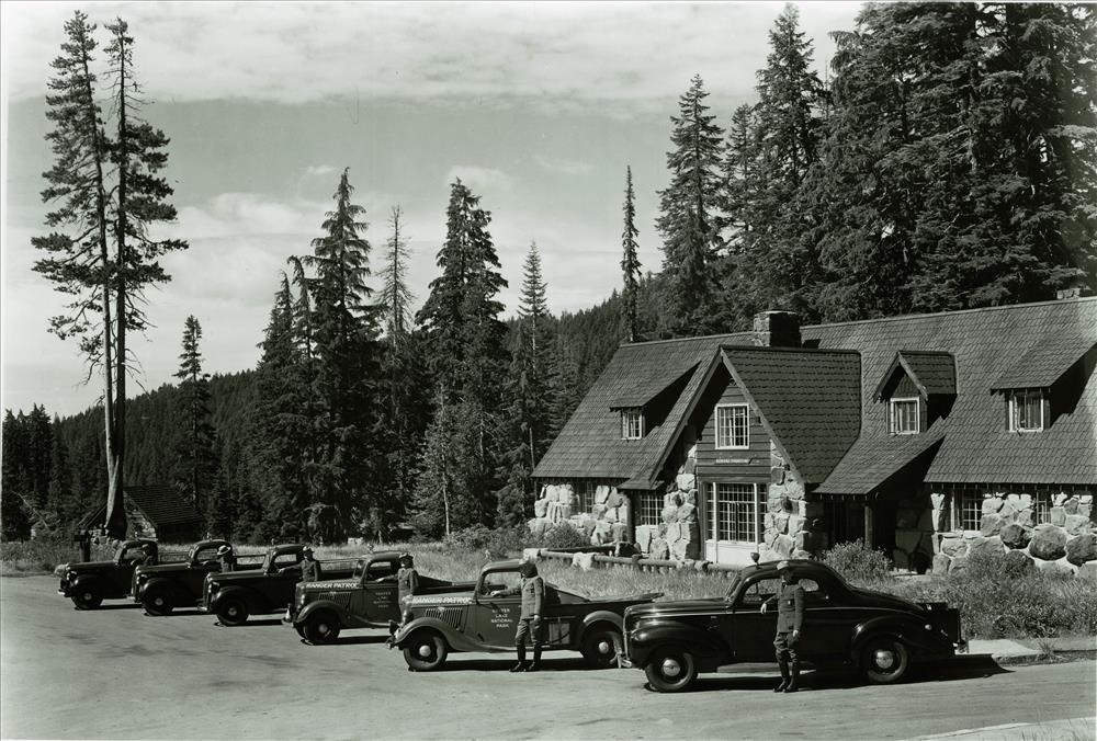 Rangers Motor Equipment in Crater Lake NP, 1941 front of Ranger Dorm, HQ