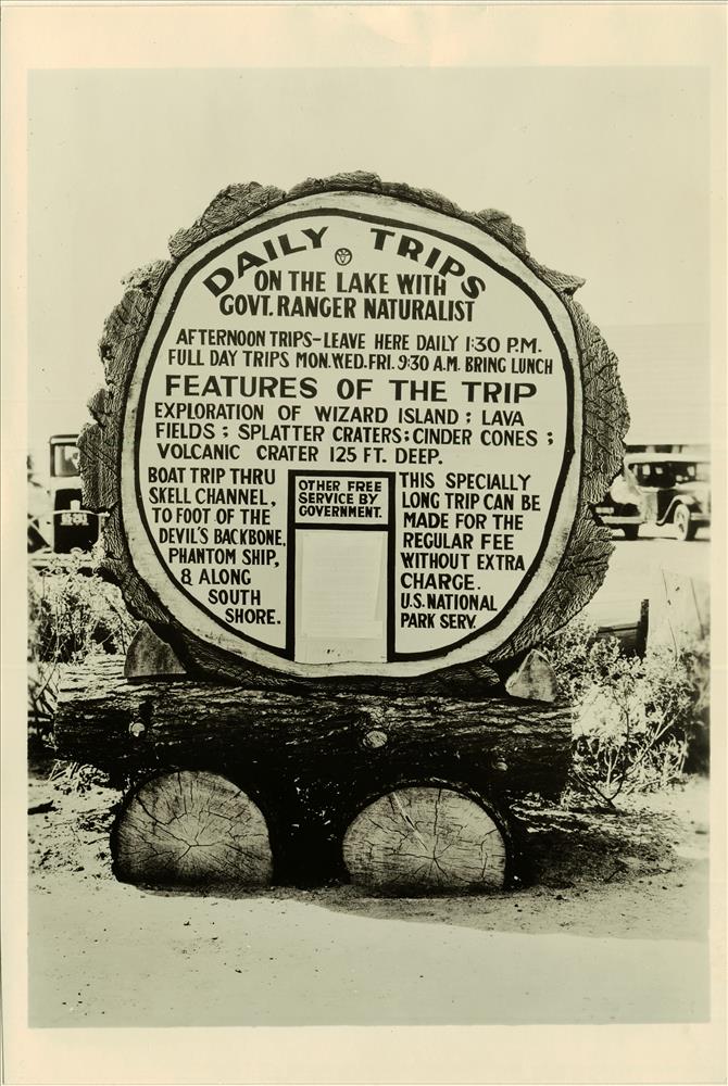 Sign at Rim Area advertising daily trips on the lake with a Ranger Naturalist in Crater Lake NP, 1933