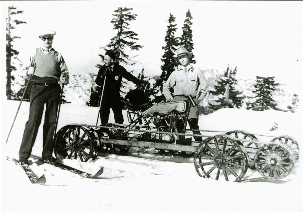 Two skiers and a partially uniformed ranger next to Ike Davidson’s snow machine in Crater Lake NP, circa 1931-1932