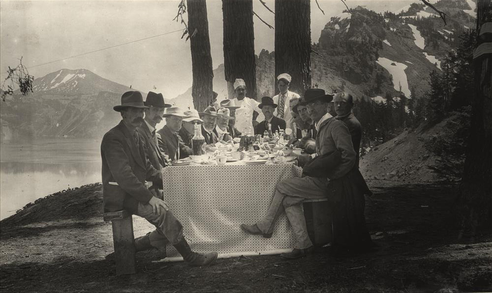 1907 Secretary of the Interior under President T. Roosevelt, James R. Garfield, the third son of President James A. Garfield, (4th on left) proved himself to be a hardy bather during a buggy ride to Crater Lake by swimming both in the Rogue River near Natural Bridge and by dipping in the sapphire-blue waters of the Lake itself. (Medford Daily News)