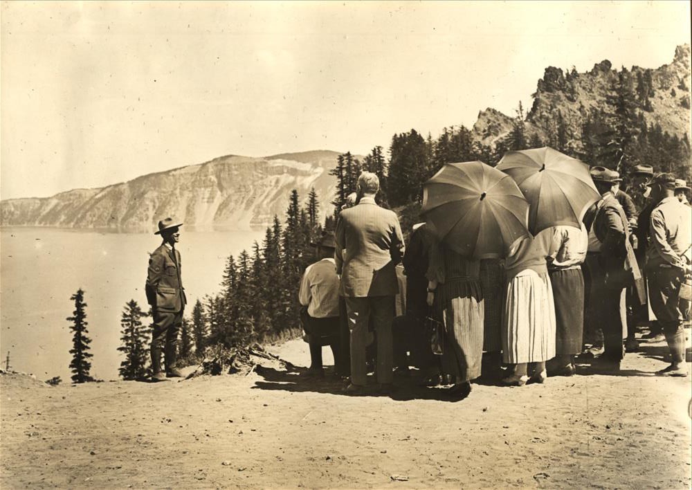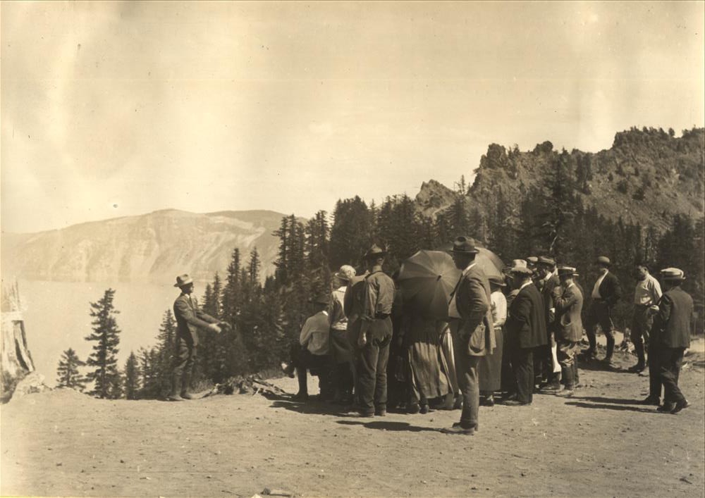 Naturalist (Interpretive) Ranger on caldera rim speaking to a group of visitors; view of lake and Garfield Peak in background 1935