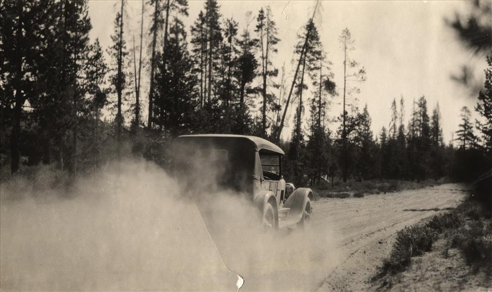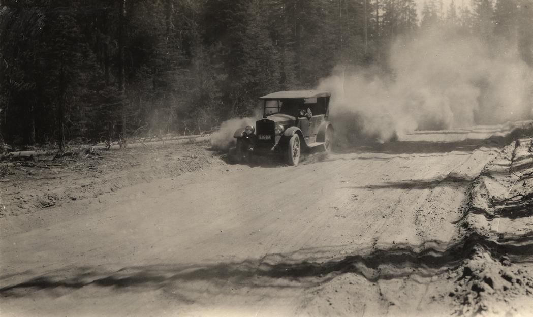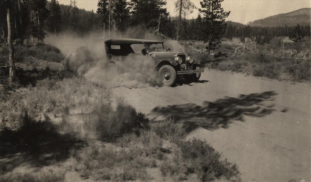 Old Flint auto in pumice dust on East Entrance Road in Crater Lake NP, 1920s