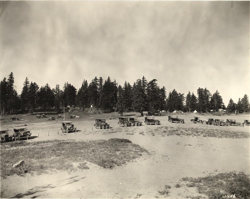 Visitors in the rim parking area and Rim campground in background in Crater Lake NP, 1918-1919
