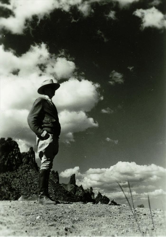 Naturalist Ranger, hands behind back, on caldera rim speaking to a group of visitors; view of lake and Garfield Peak in background 1935