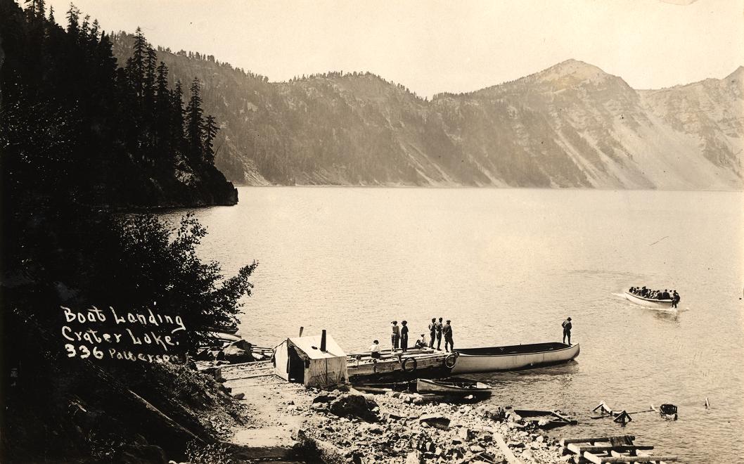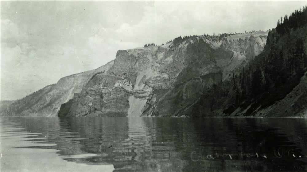 Shoreline view of Crater Lake -looking toward Sentinel Rock, 1908 Dewey Huffman photo