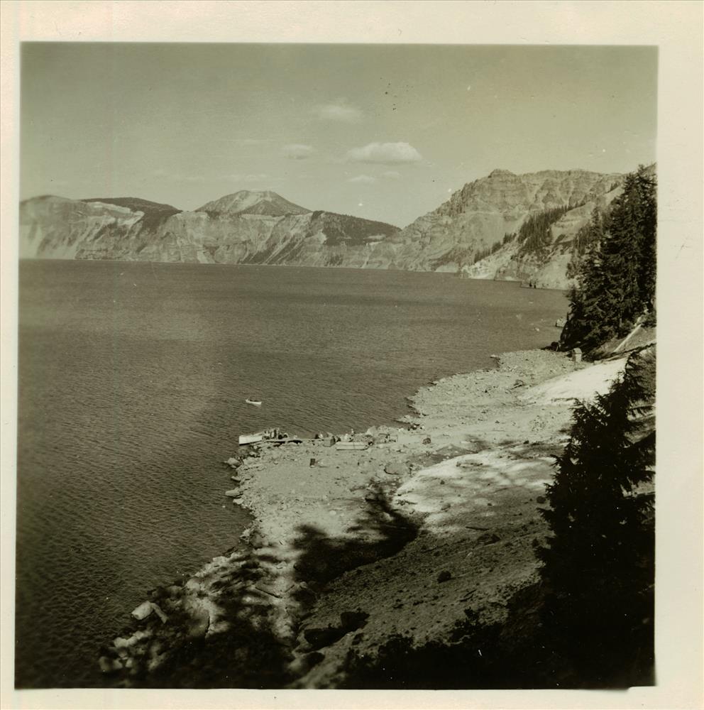 Lake Shore in Crater Lake NP (date unknown) Taken from shore, Cloudcap and faint Mount Scott in background; may have been taken from Steel Bay; Kiser black and white photograph