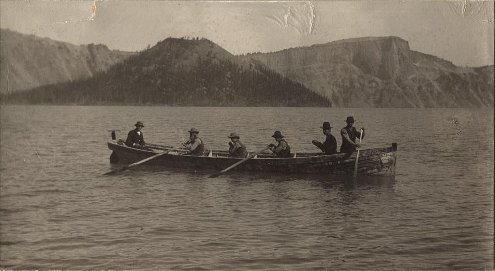 Lowering a row boat to the surface of Crater Lake, 1908 Dewey Huffman lower who built the boat 1.5m from the rim, Judge Short upper