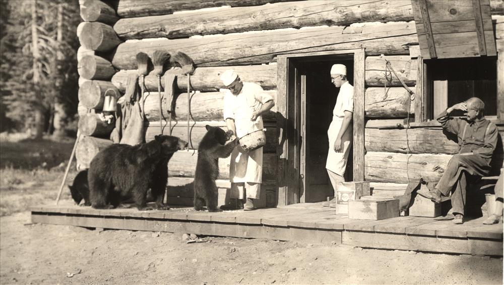 Three bears being fed by a member of the kitchen staff, another kitchen staffer in doorway of log structure, William G. Steel sitting looking on.