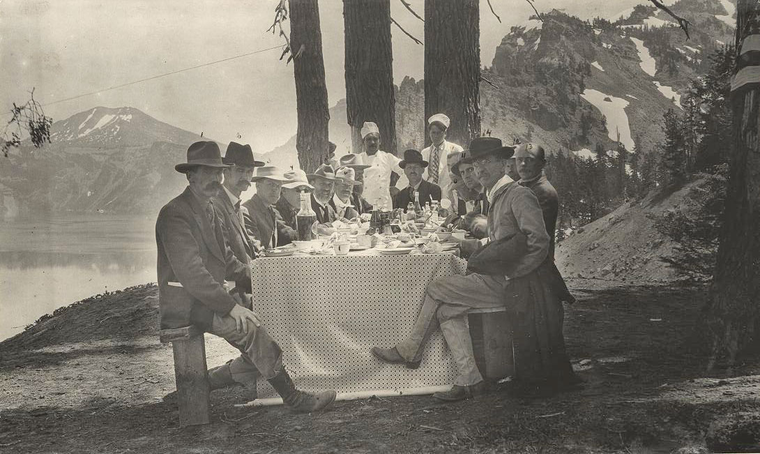1907 Secretary of the Interior under President T. Roosevelt, James R. Garfield, the third son of President James A. Garfield, (4th on left) proved himself to be a hardy bather during a buggy ride to Crater Lake by swimming both in the Rogue River near Natural Bridge and by dipping in the sapphire-blue waters of the Lake itself. (Medford Daily News)