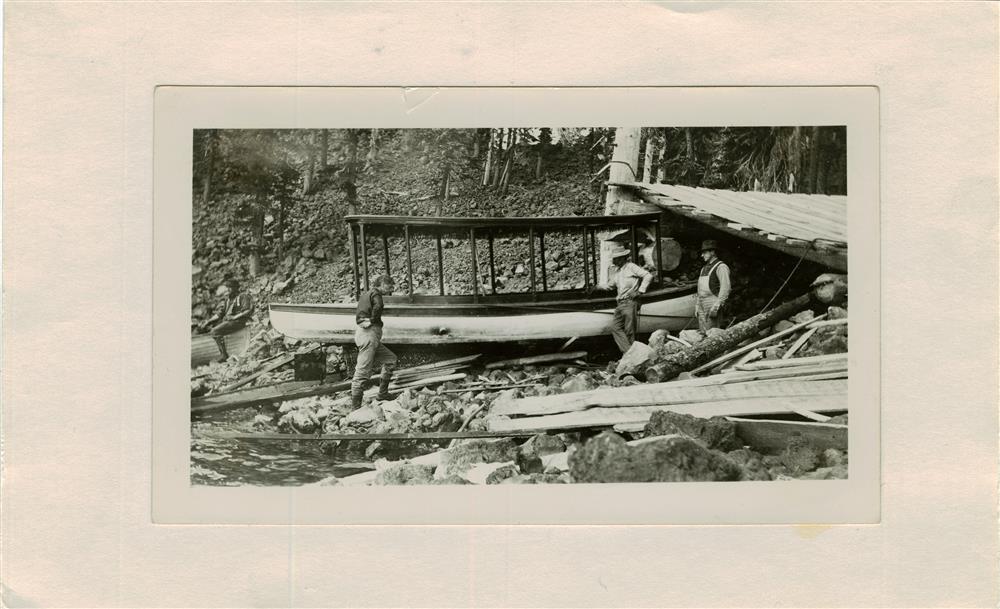 Putting The Cleetwood into the completed boathouse. From the left – , Will G. Steel, Mike Taylor, Capt. George Woodbury. Wizard Island, Summer 1908 Photo by Dewey Huffman