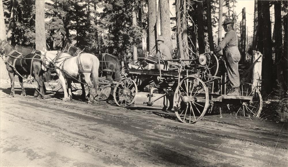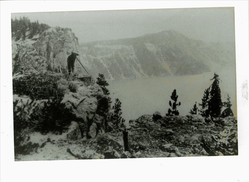 G. V. Robinson and transit, The road runs here. Crater Lake NP, 1918