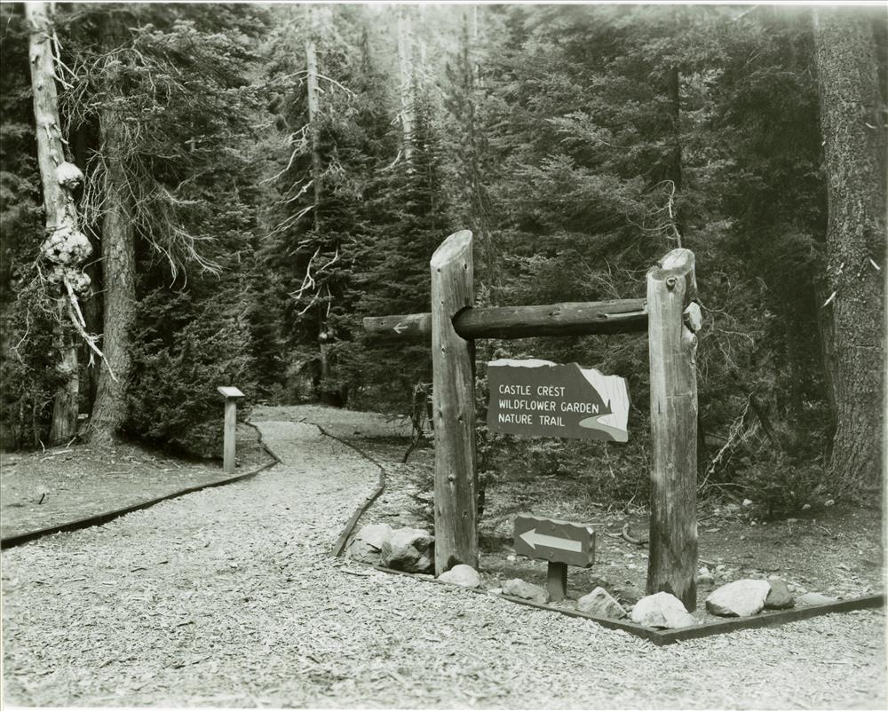 Castle Crest Wildflower Garden Nature Trail sign. Across from the Steel Circle along the Rim Drive K.R. Cranson August 23, 1968