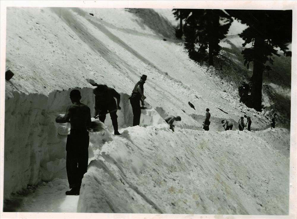 Shoveling snow from lake side trail in Crater Lake NP, 1951