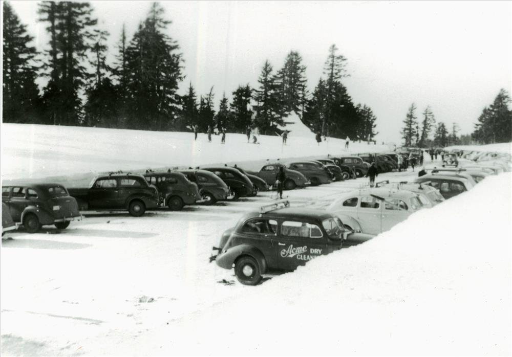 Parking on winter weekend in Crater Lake NP, circa 1948 Guy Hartell photo Hartell Collection
