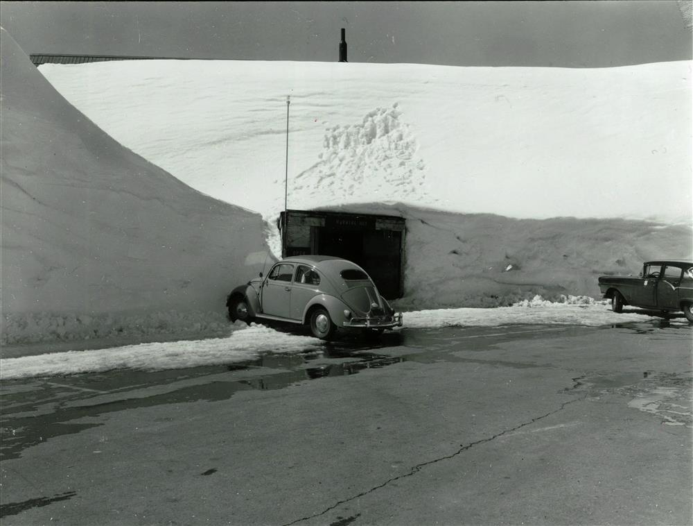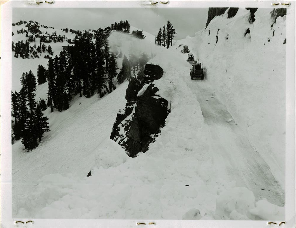 Snow removal, Spring. North Entrance Road. Spring Road opening near Watchman in Crater Lake NP, 1958 Rundell