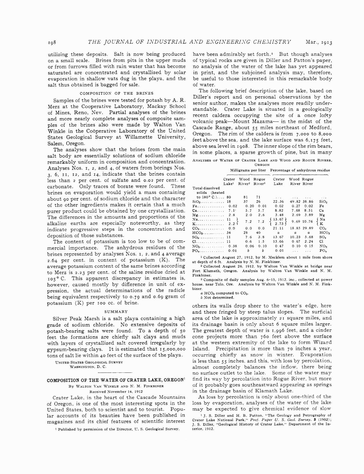 Composition of Water of Crater Lake, Van Winkle 1913