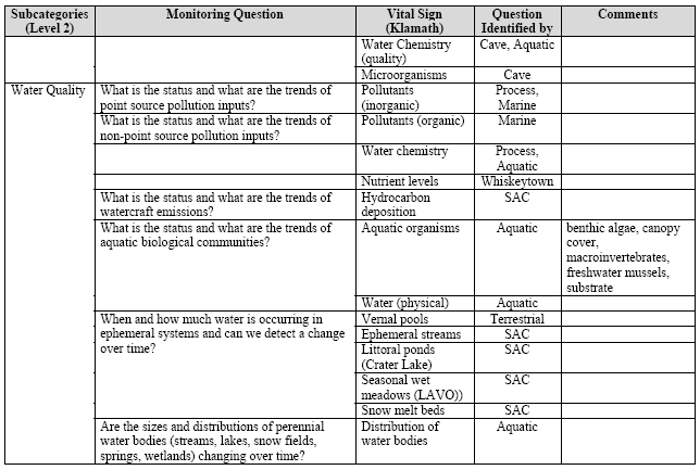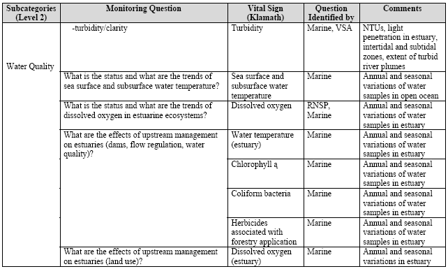 - Stream sediment transport. Sediment data, both suspended and bedload, are required for the evaluation of stream sediment yield with respect to (1) background environmental conditions (geology, soils, climate, runoff, topography, ground cover, and size of drainage area), (2) historic and current land use, and (3) erosion and deposition in channel systems. Additionally, understanding the temporal distribution of sediment concentration, size characteristics, and transport rates is crucial to the management of in-stream aquatic communities and riparian ecosystems. Standardized sediment sampling methods and the frequency of collection will be dictated by the hydrologic and sediment characteristics of the water body to be sampled, the required accuracy of the data, the funds available, and the proposed use of the collected data. Also during the May 2004 vital signs scoping meeting, the Level 1 category, water, was divided into three Level 2 subcategories (i.e., hydrology, subterranean, and water quality). General conceptual models of freshwater and marine ecosystems (e.g., Attachment III, pages 146-154) were used by participants to help organize and frame the discussions of ecosystem processes, dynamics, and linkages. Out of these discussions, general, broad-scale monitoring questions were developed and associated vital signs were identified for each Level 2 subcategory. The outcome of this process is presented in Table 12. Full details of the results of the May 2004 meeting are available in Appendix G of Sarr et al. (2004). These general monitoring questions and vital signs were assessed and refined (i.e., narrowed) during subsequent scoping meetings (see pages 55-85 and Tables 14-24).