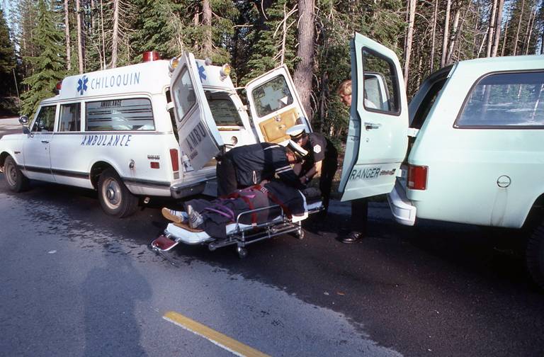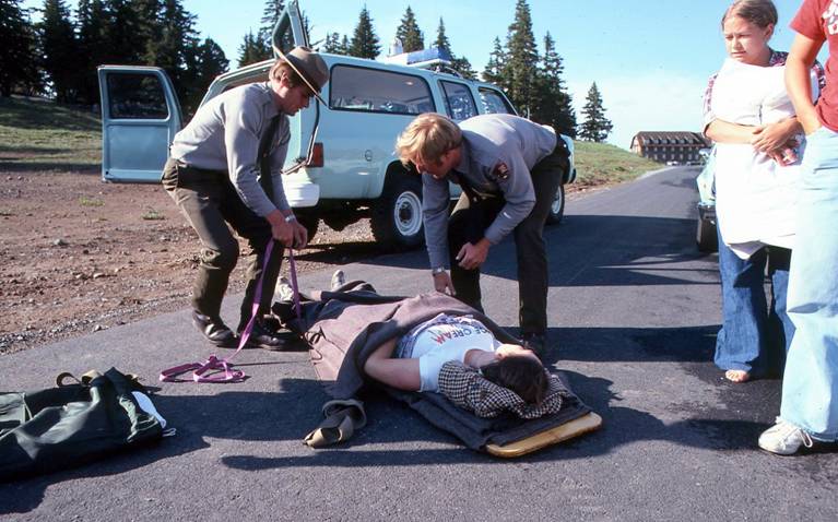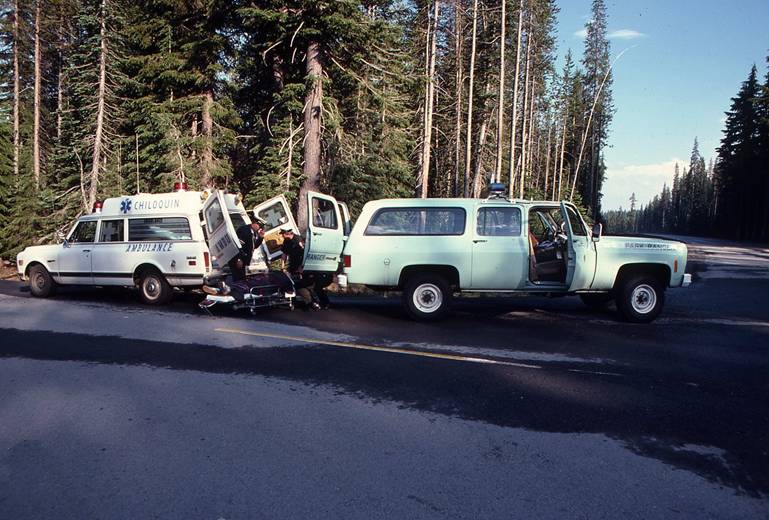Park Rangers do many things at their jobs, including helping people in distress. Crater Lake is a very long way from normal medical service, so when something happens, a heart attach from the high altitude at the Rim or falling off a bicycle, these first-line of safety are the boys in green! Thanks to Lloyd and Larry Smith for these photos.